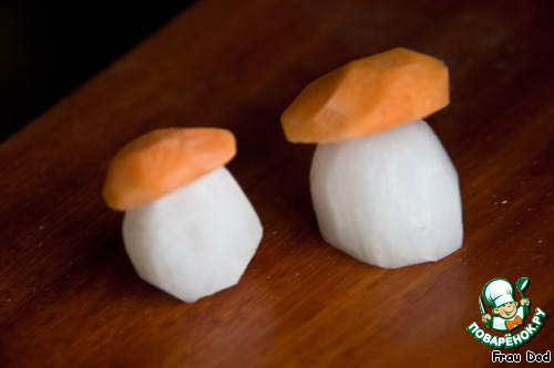 Очистить редис, вырезать из него ножки для грибочков. Из морковки сделать шляпки. Скрепить зубочисткой.