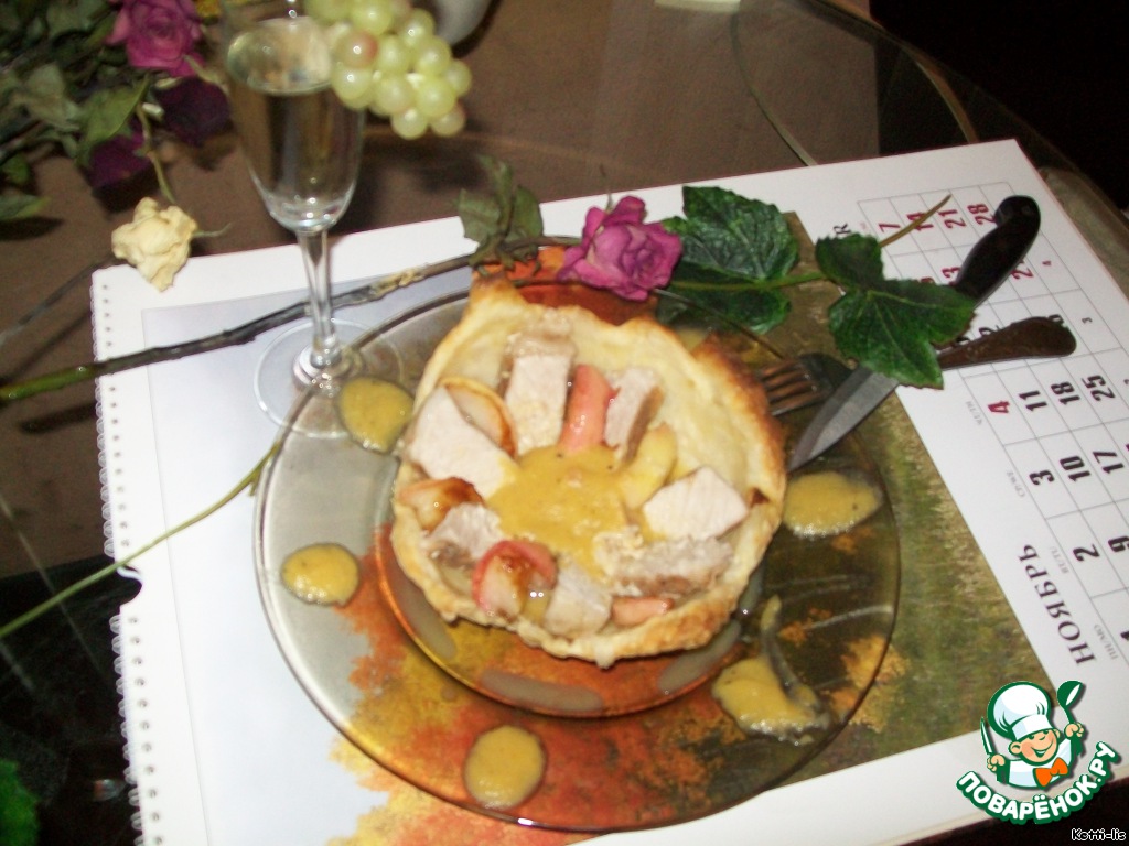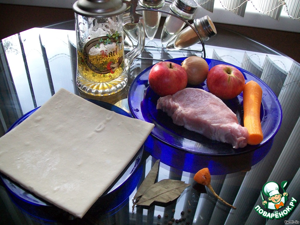 Просто порезать мясо на куски. Добавить яблок. А яблоки мы поджарили, присыпав сахаром и не много мукой. И можно наслаждаться)
