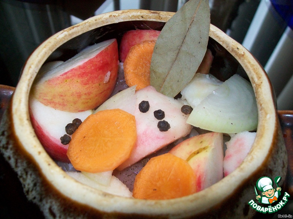 Морковь и лук порезать, положить на дно горшочка, потом мясо, натерев его солью и перцем. Сверху опять морковь и лук, и яблоки. Яблоки у меня с дачи. Выросли, сами по себе)))) Я обожаю готовить, но не люблю копаться в земле и чего-то растить. Что выросло, то и выросло. Мне вот папа с дачи звонил и говорил, что яблоки отдает на свиноферму, свиней кормить. И слава богу хоть кому-то пригодились.