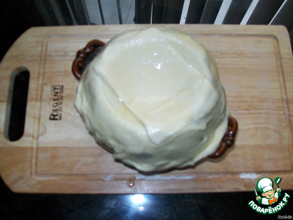 Ну залепили). Через 20 минут вытаскиваем. У нас корзиночки из слоенного теста и мясо в горшке. Вынимаем мясо. А всю жидкость блендером. В итоге получается совершенно бархатистый соус из мясных соков, хмеля от пива и яблок домашних) Остается только одно.
