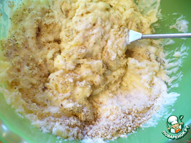 Картофель остудить, очистить, размять. Добавить яйца, сыр, майонез, муку, орехи. Посолить, поперчить, все хорошенько перемешать.