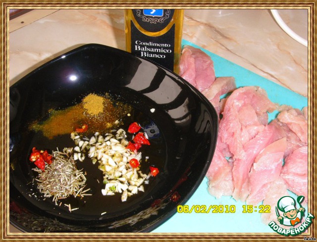 В чашку для маринада кладем кунжутное масло, мелко нарезанный чеснок, острый перец, карри, розмарин, куркуму, кумин и уксус.