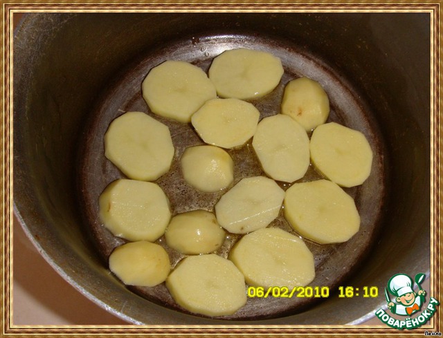 Нарезанная картошка будет заменять газмах. На дно кастрюли налить 1-2 ст.л. топленного масла. Разложить картофель.