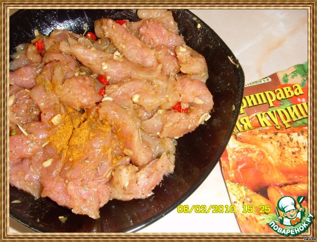 Закладываем полоски грудинки, сверху обсыпала приправой для курицы. Хорошенько руками перемешать. Накрыть и оставить мариноваться.