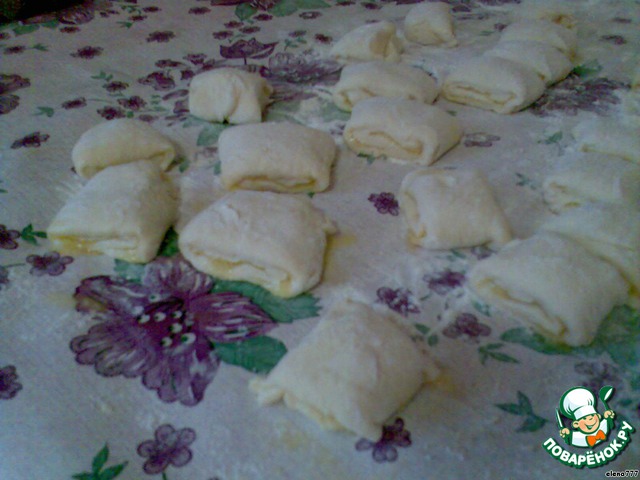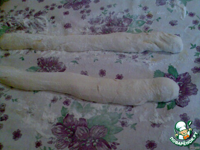 Займёмся тестом: раскатанное и смазанное тесто разрезать пополам и скатать в рулетики.