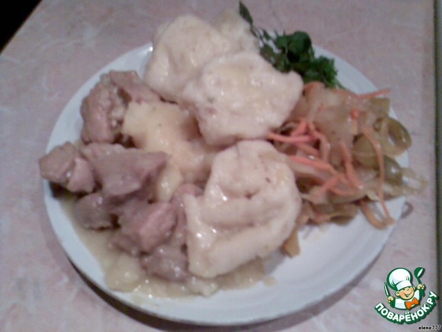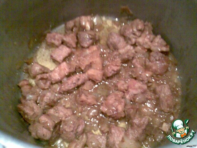 Ой, простите, после того, как поставили тесто в тёплое место, надо заняться с мясом: нарезать свинину кусочками, слегка подрумянить в сковороде и тушить минут 30-40, затем добавить порезанный лук, посолить, поперчить, посыпать специями и слегка потушить с небольшим количеством воды.