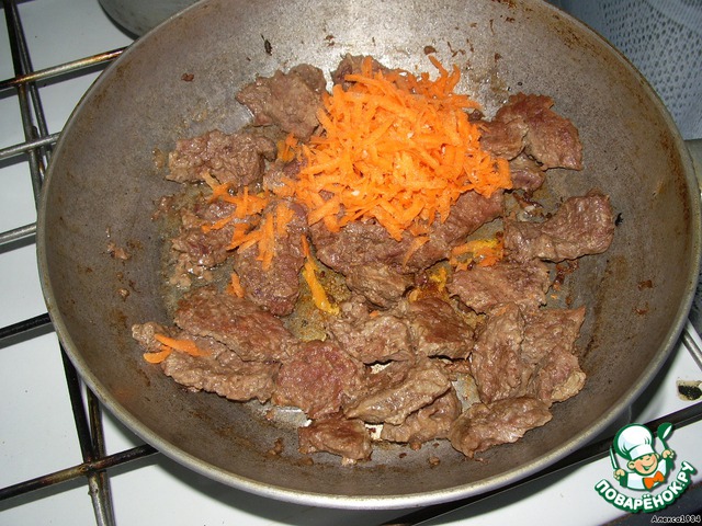 Режем мясо кусочками, кладём в сковороду, наливаем воды так, чтобы покрыло мясо полностью, солим, перчим, накрываем крышкой и готовим на среднем огне (минут 40-45) когда вода выкипит, обжариваем мясо до золотистой корочки. Далее натераем морковь на крупной терке и добавляем к мясу и обжариваем. Потом добавляем чуть-чуть водички.