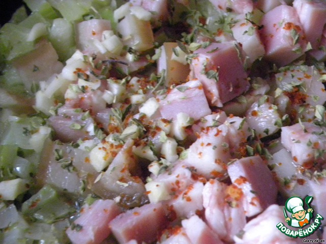 Мелко режем лук и сельдерей, обжариваем на растительном масле до прозрачности, добавляем кусочки бекона, чеснок, перец чили, орегано и палочку корицы.