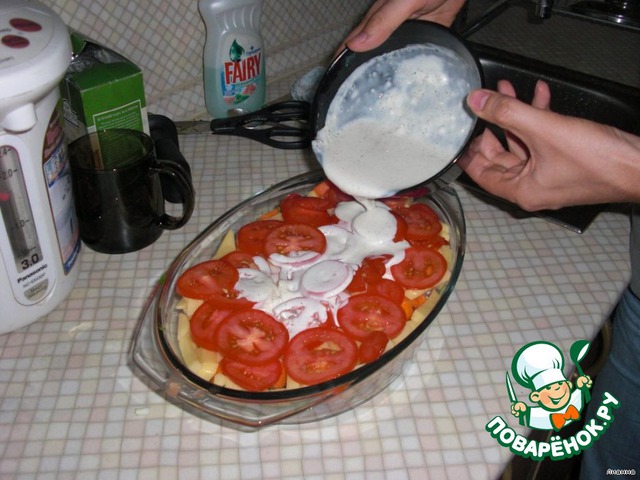 Залить нашу слоёную заготовку, накрыть крышкой или фольгой и поставить в духовку.