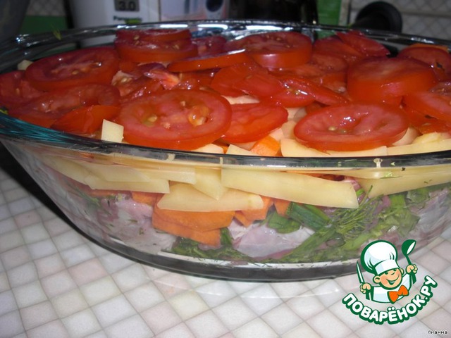 В емкость уложить мясо, на него лук, затем зелень, затем морковь, картофель и сверху помидоры.