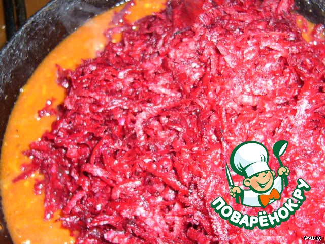 Теперь добавляем измельченную свеклу, соль, немного воды, перемешаем, накроем крышкой и пусть все овощи хорошо познакомятся друг с другом (мин 15).