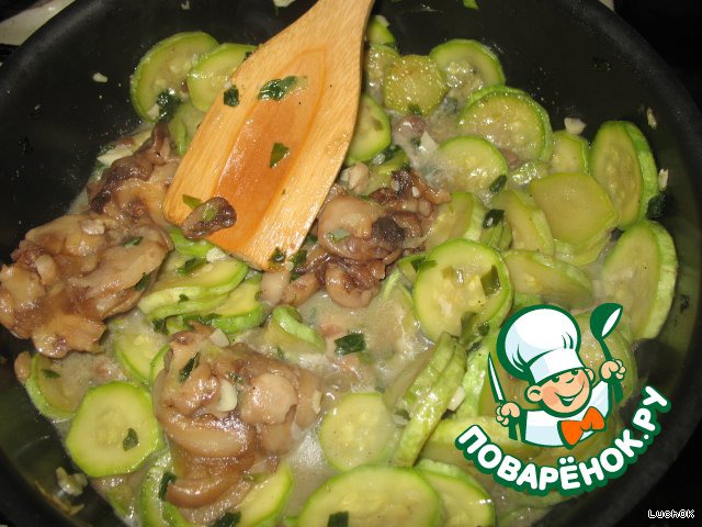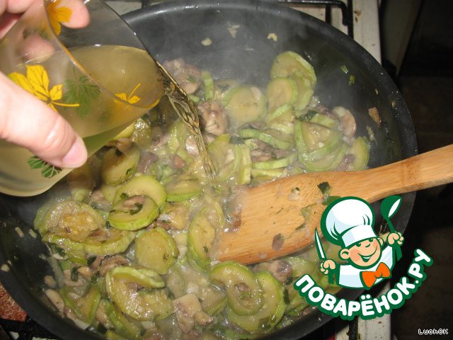 Поскольку у меня были замороженные грибы, они дали очень много воды. Нужно её немного повыпаривать из сковороды, увеличив огонь, время от времени помешивая.
