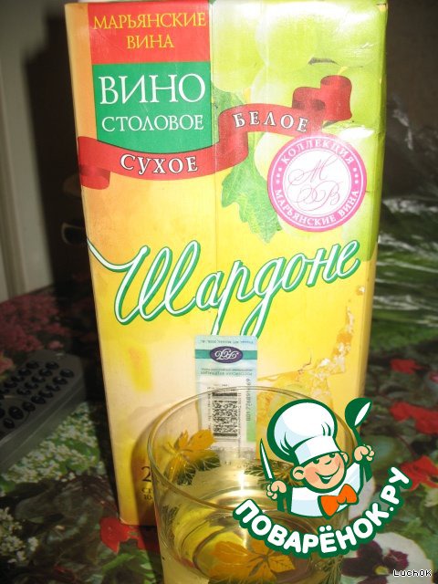 Приготовить полстакана белого сухого вина. Не обязательно брать какое-то супер дорогое. Достаточно обычного нашего "совкового" Шардоне. Главное, чтобы сухое было, а не полусладкое.