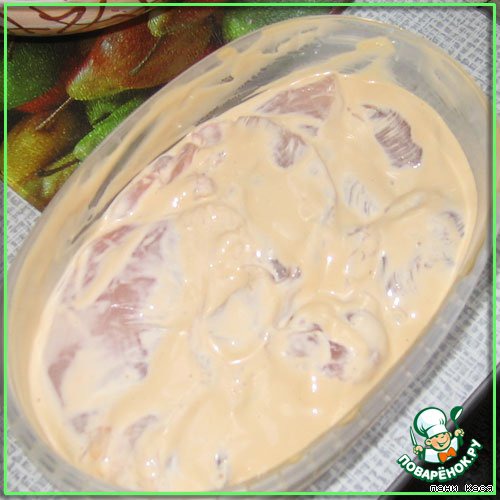 Режем порционно грудки, маринуем их в смеси соевого соуса и майонеза. НЕ СОЛИТЬ!