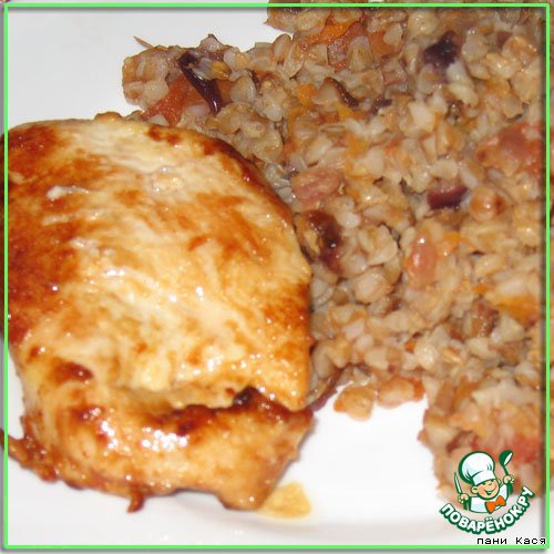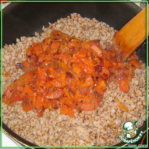 Гречку смешиваем с зажаркой, даем потомиться, пока курица жарится с 2 сторон