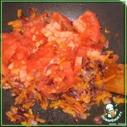 Помидор очищаем от кожицы, режем мелко, добавляем в зажарку