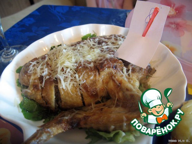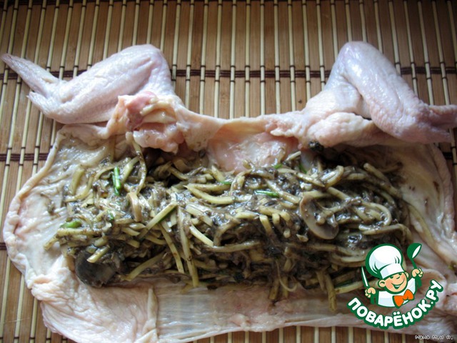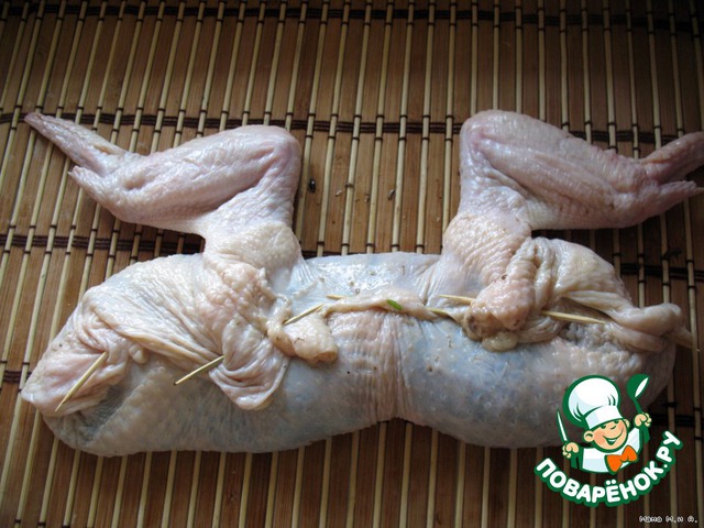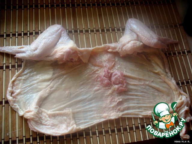 Приготовить кожу цыпленка. Разрезать по грудной косточке, аккуратно снять кожу, подрезая, где необходимо. У меня это заняло 15 минут. Крылья не трогаем - они изображают улёт :D