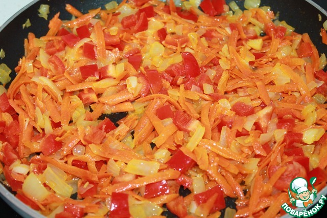 Тушим перец, лук и морковь на сковороде до мягкости. При необходимости добавляем бульон. Масло лишнее лучше не добавлять.
