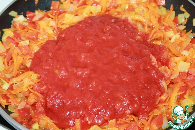 После чего к овощам добавляем томаты в собственном соку. Можно использовать свежие помидоры, предварительно сняв кожуру. Томатную пасту лучше не использовать, вкус будет другой.