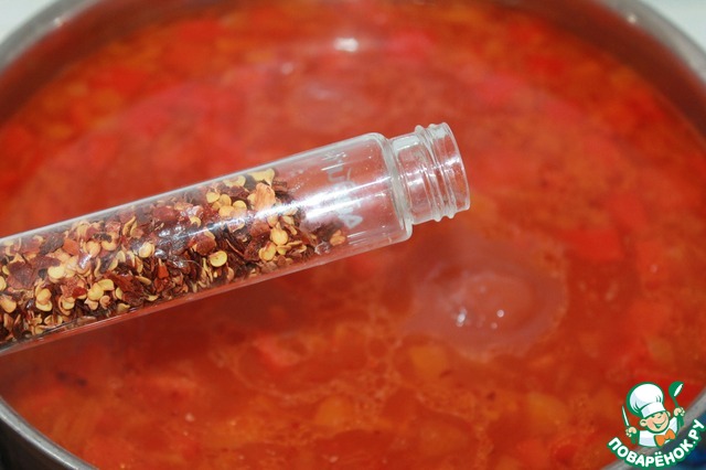 После чего добавляем перец чили. У меня сушеный, можно использовать свежий. Но очень аккуратно, добавив чуть больше можно полностью испортить весь вкус. Продолжаем варить суп еще примерно 30 мин. на медленном огне.