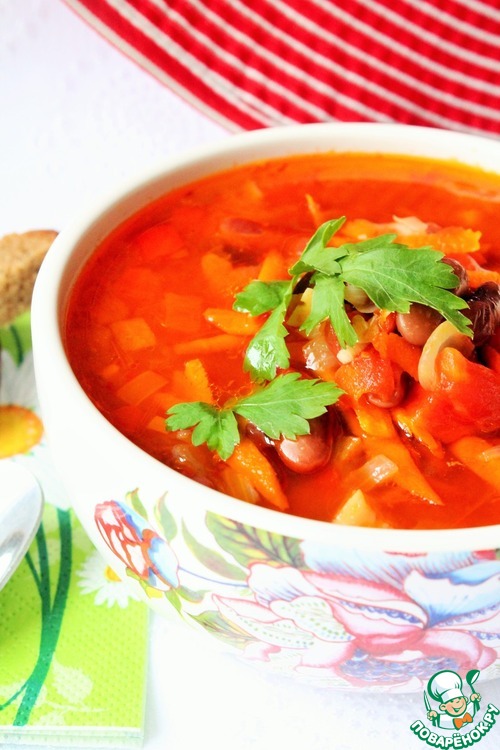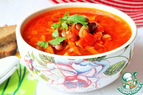 Польза этого блюда конечно же в красной фасоли, которая является исключительно полезной. Красная фасоль - продукт лекарь. В фасоли есть практически все, что требуется для жизни и деятельности нормального здорового организма. Во - первых, фасоль – это растительные белки. Плоды фасоли по содержанию в них белка близки к рыбе и мясу. Этот белок легко усваивается организмом человека. И, кроме того, белки, животного происхождения обычно сопровождаются животным жиром, а красная фасоль этих жиров не содержит. Во-вторых, полезные свойства красной фасоли связаны с тем, что она богата клетчаткой. Клетчатка не только дает чувство сытости, она помогает вывести токсины из организма, стабилизирует сахар в крови и предохраняет от возникновения злокачественных опухолей. Из-за богатства и разнообразия витаминов, содержащихся в ней, употребление красной фасоли благотворно действуют на иммунную систему, улучшает работу нервной системы и состояние кожи. Фасоль богата макро и микроэлементами – медь, цинк, калий, различные кислоты, каротин – все это совершенно необходимо нашему организму. И еще одно полезное свойство красной фасоли – это незаменимые аминокислоты: триптофан, лизин, аргинин и. т. д. Полезные свойства красной фасоли заключаются и в ее очищающем действии на организм. Кожура зерен фасоли оказывает мочегонное действие. При заболеваниях почек, печени, мочевого пузыря, при сердечной недостаточности, диабете часто в диетическом питании используется фасоль. А в сочетании с овощами, бульоном и помидорами это исключительно полезный продукт.