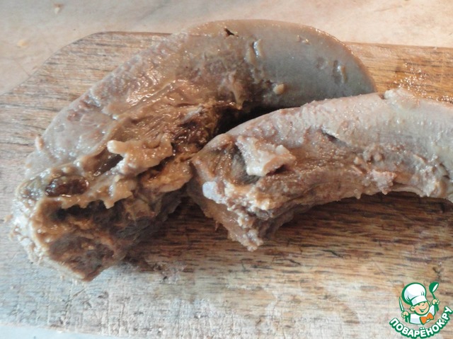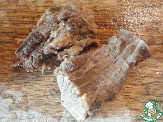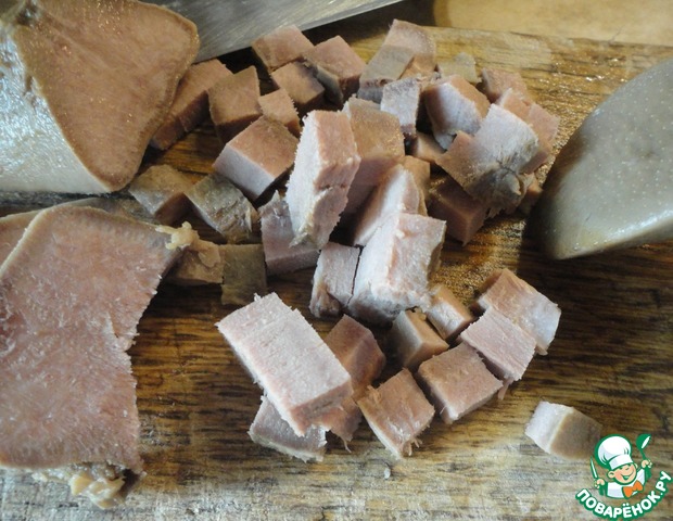 Срезаем с языка темное мясо (которое у основания) и режем его очень мелко.