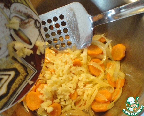 Кладем чеснок и обжариваем все на среднем огне около 7 минут