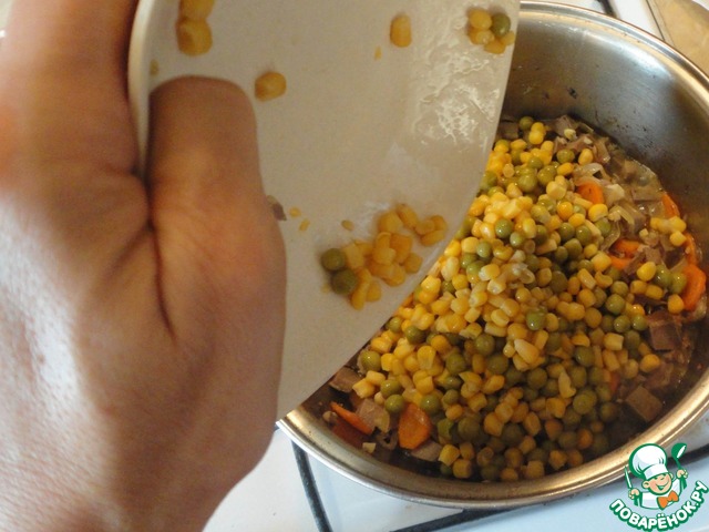 Добавляем горошек с кукурузой. Накрываем крышкой и тушим на среднем огне 5-7 минут.