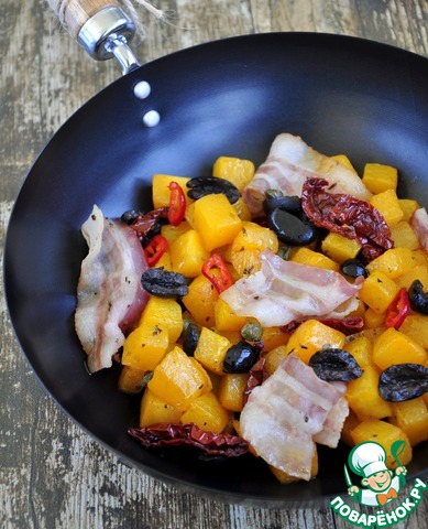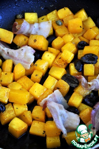 Добавить бекон, маслины раздавить ладонью на деревянной доске, удалить косточку. Добавить каперсы, маслины.