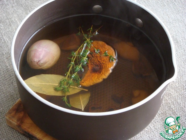 Сварить крепкий грибной бульон, на основе сухих грибов и жидкости, в которой они замачивались, с добавлением луковицы, черного душистого перца, лаврового листа, кусочков свежих грибов и нескольких веточек тимьяна. Соль и перец по вкусу.