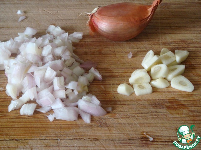 Лук шалот измельчить, зубчик чеснока порезать на тонкие пластинки.