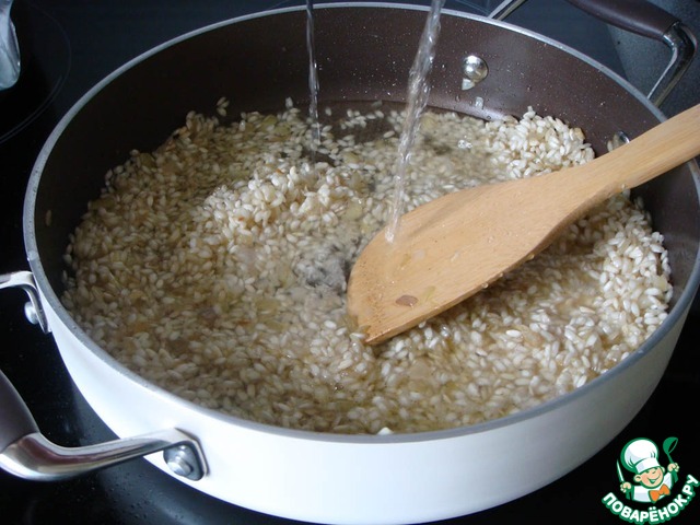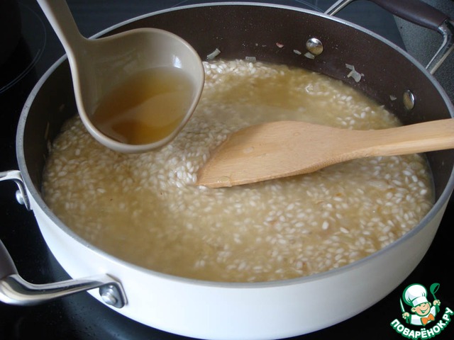 Когда вино будет выпарено, можно начинать добавлять бульон. Сначала 2 половника. Продолжая постоянно помешивать ризотто, бульон постепенно добавляется по одному половнику по мере испарения предыдущего, как только ризотто начинает густеть - добавляется следющий половник бульона.