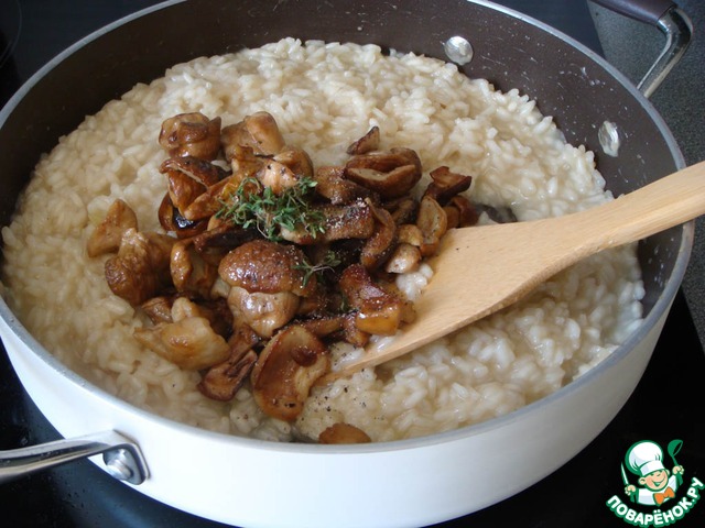 За несколько минут до готовности в ризотто нужно вернуть грибы и аккуратно их вмешать. Вместе с грибами добавляются листочки тимьяна. После чего огонь выключается.