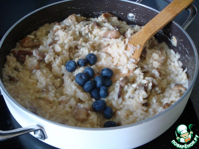 *Если ягоды все же не уцелели - ничего страшного, просто цвет получится "грязным". У итальянцев есть чисто черничное ризотто сине-фиолетового цвета, но в случае с грибами цвета лучше не смешивать.