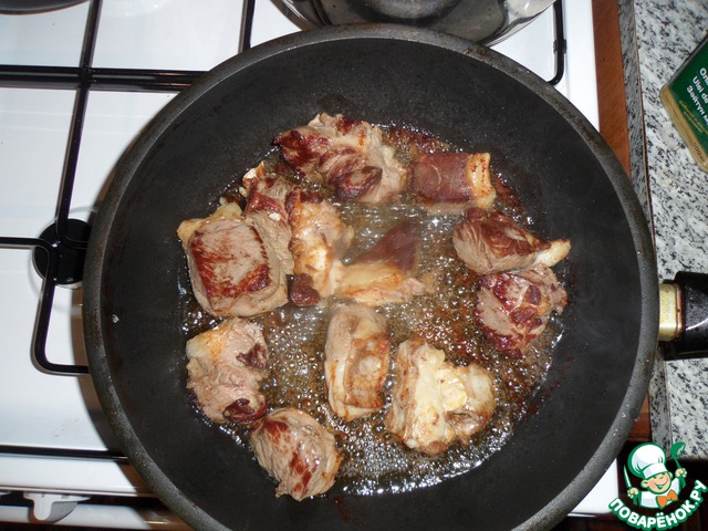 Ну делу время - потехе час. Не для шкварок же мы это затеяли. Обжариваем на нашем вытопленном сале мясо до появления аппетитной корочки на большом огне. Мясо при обжарке не солим, не перчим.
