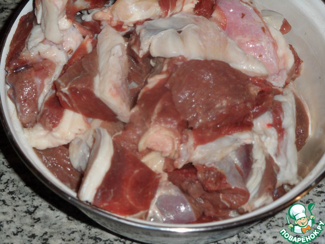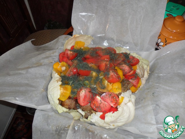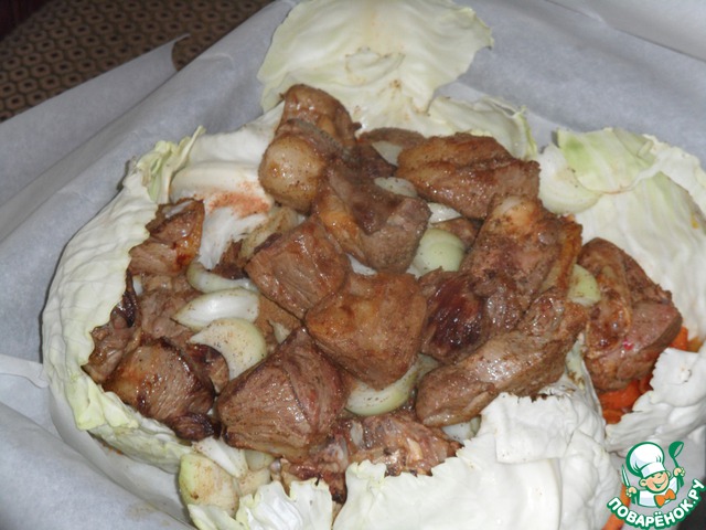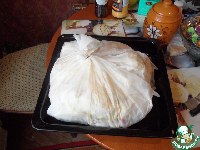 | Рецептик взят из книжки Сталика Ханкишиева. Сталик решил приготовить в духовке аналог блюда кочевников. Разделанное мясо барана укладывали в подготовленную ошпареную шкуру без шерсти, добавляли лук и что бог пошлет, увязывали в узел и закапывали под костром. Костер жгли долго. А утром выкапывали шкуру и кушали. То есть мясо готовилось длительное время с постепенно падающей температурой. Роль шкуры выполила у Сталика пекарская бумага, а роль постепенно затухающего костра -духовка. |