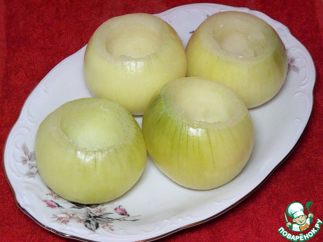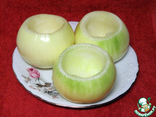 Аккуратно вынуть внутренную часть у лука при помощи ножа и ложки, оставив стенки толщиной 1 см.