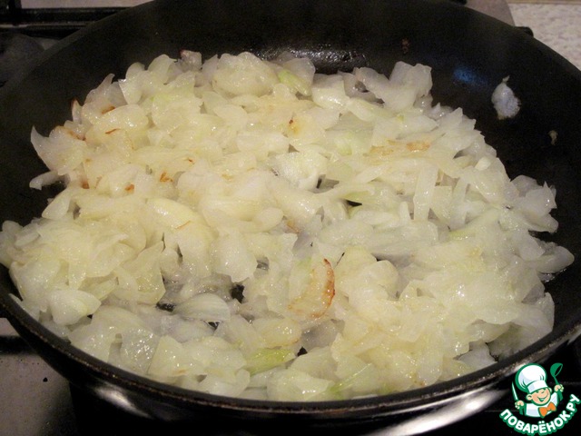 Внутренную часть лука нашинковать и обжарить до золотистого цвета.