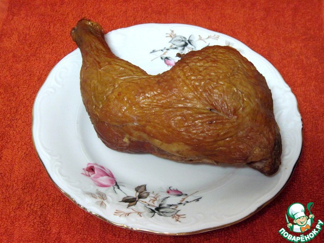 С копченного окорочка снять кожицу, отделить мясо и порезать кубиками.