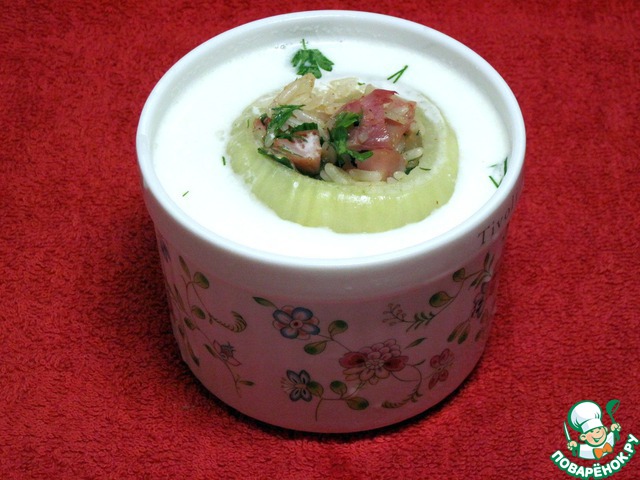 Нафаршировать лук начинкой, поместить в высокую форму и залить соусом.