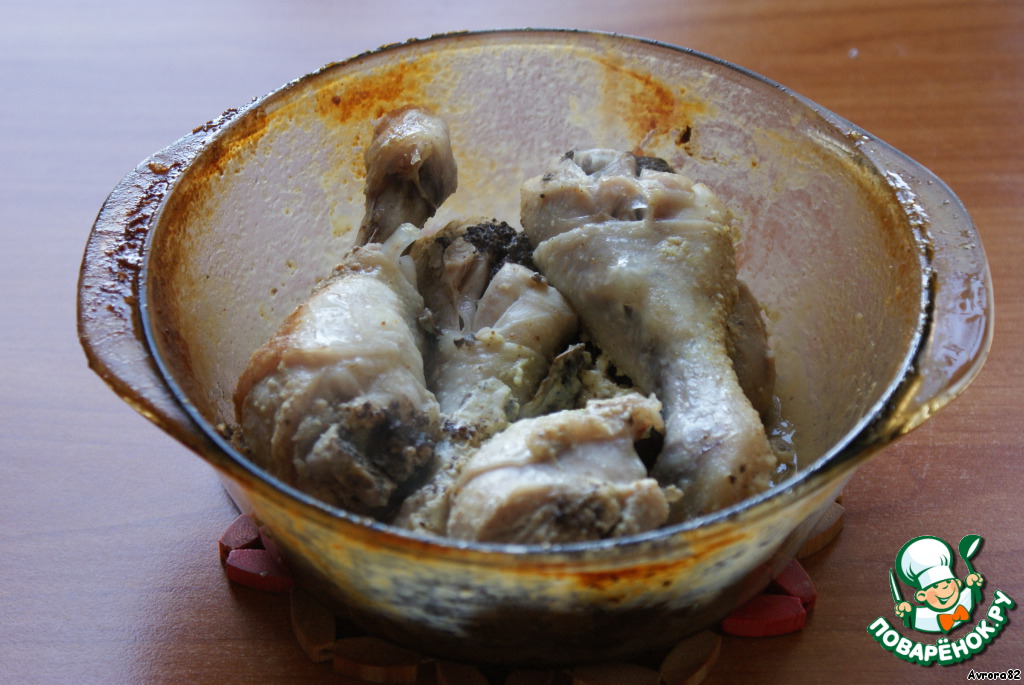 Куриные голени (это могут быть окорочка, чахохбили, крылья, бедра - кому что нравится) моем, по желанию снимаем кожу и складываем в жаропрочную посуду. У меня она вмещает только 4 голени. Туда же выдавливаем чеснок и режем шампиньоны (можно без грибов, тоже ничего). Все это дело солим, приправляем и перемешиваем. Если позволяет время, можно оставить помариноваться.