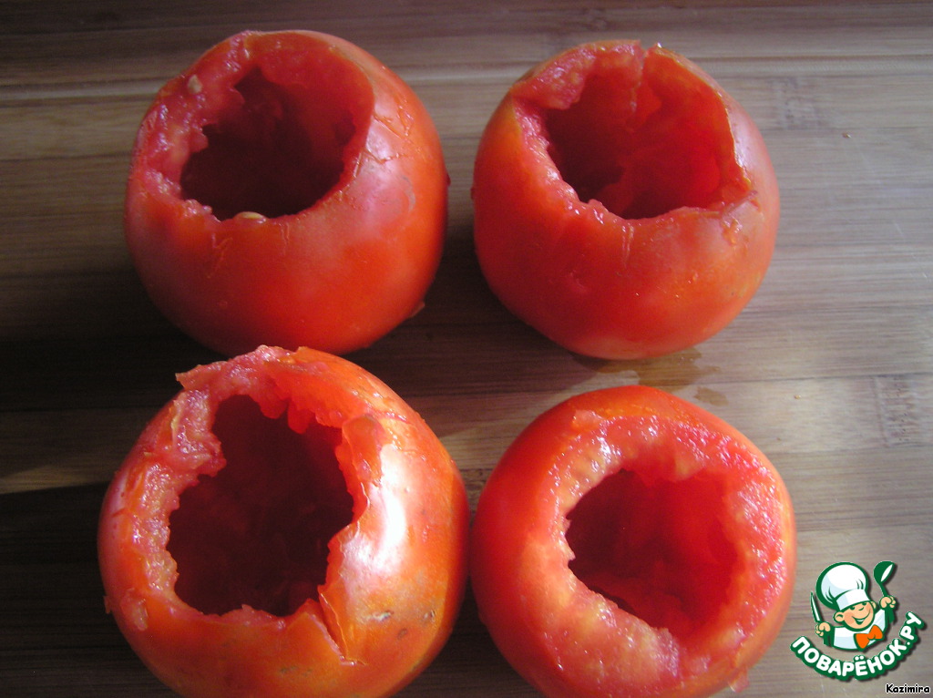 У помидоров удаляем сердцевину, но не выбрасываем её, а разминаем вилкой в отдельной тарелке.