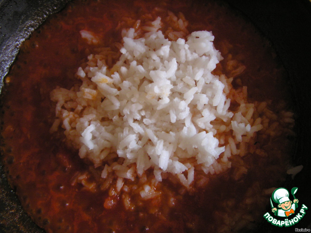Размягченную сердцевину выкладываем в сковороду, солим, перчим и тушим на маленьком огне до выпаривания жидкости. Добавляем отваренный заранее рис.