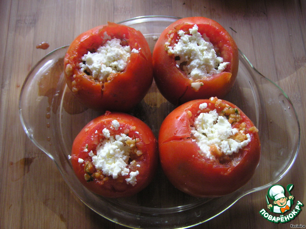 Смешиваем все - начинка готова. Фаршируем ею помидоры. Посыпаем сверху соленым творогом.