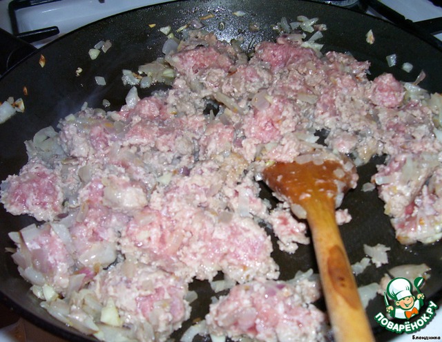 Добавляем к луку фарш и обжариваем его до полуготовности, солим и добавляем приправы (у меня это паприка, черный перец, кориандр, карри, и чуть-чуть молотой зиры). У меня фарш был говядина + свинина, если вы хотите совсем "восточности", то, конечно, нужно брать фарш или из говядины, или из баранины.