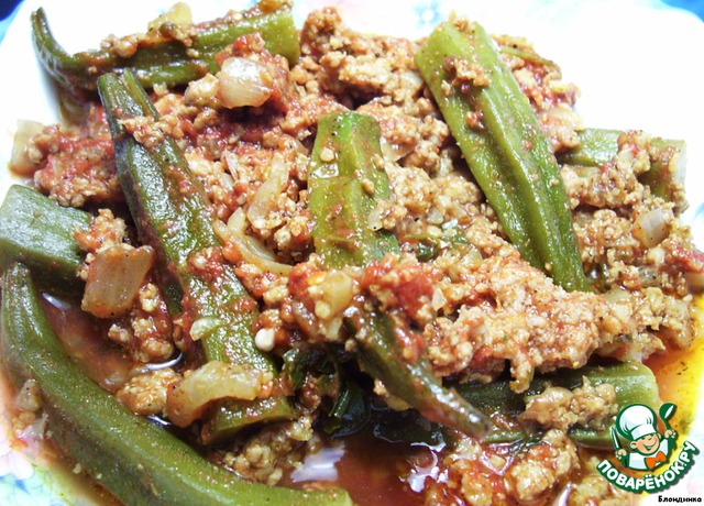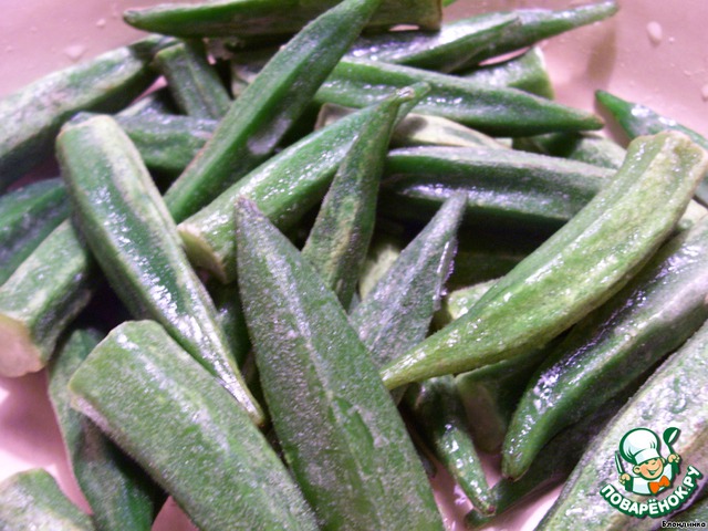 И отправляем на ту же скороводу, где до этого у нас обжаривалось мясо. Бамию, помешивая, обжариваем минут 5-7.