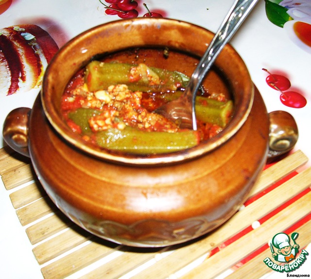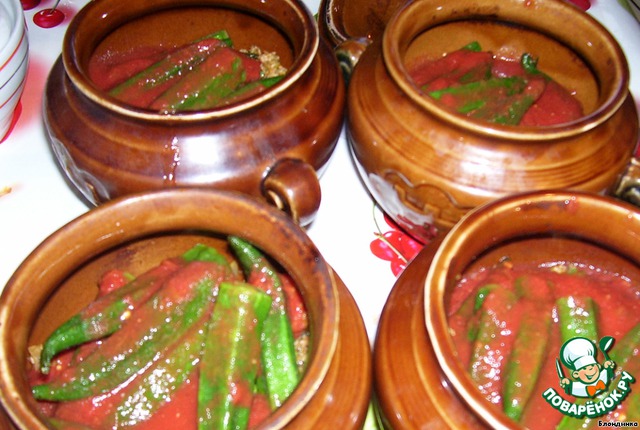 Складываем наши ингредиенты в горшочки - сначала бамию, потом мясо и снова бамию, посыпаем нарезанной петрушкой. Заливаем томатным соком, который предварительно солим по вкусу. Отправляем горшочки в предварительно разогретую до 160-180 градусов духовку на 30 минут.