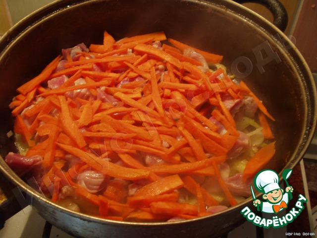 Сначала на сковородку кладем лук, чтобы чуть-чуть подрумянился. Потом пупки и морковь.