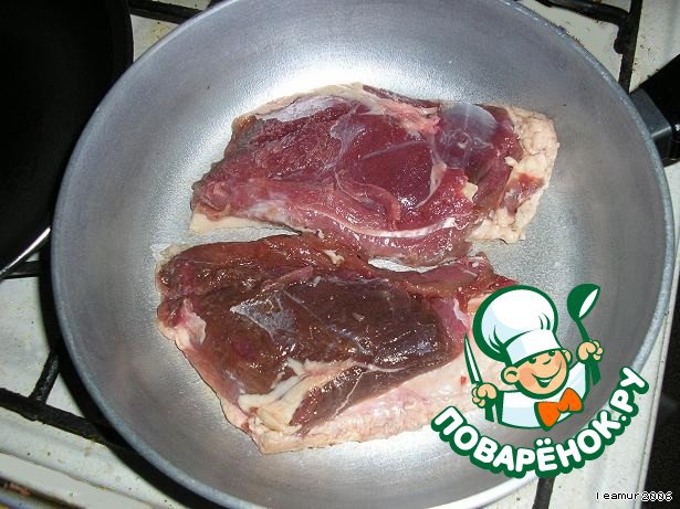 Обжарить целыми кусками на сухой горячей сковороде. Сначала кожей вниз, потом перевернуть (под кожей или, можно сказать, в коже содержится много жира), жарить с каждой стороны минуты по 4