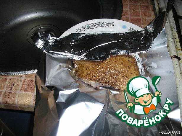 Обжаренное мясо завернуть в фольгу.